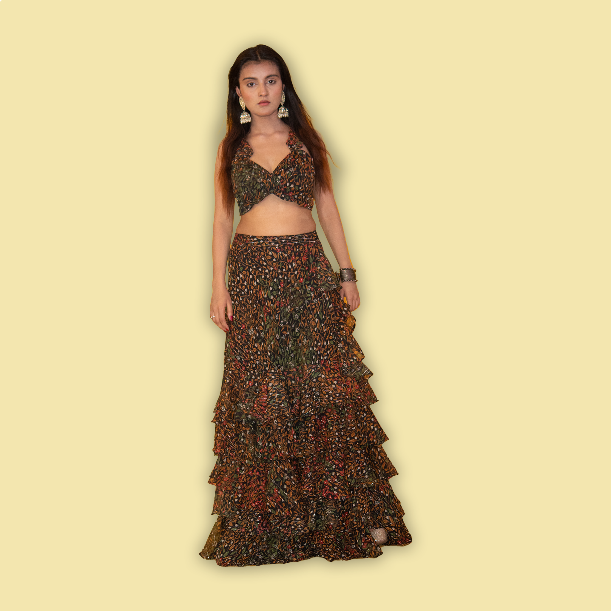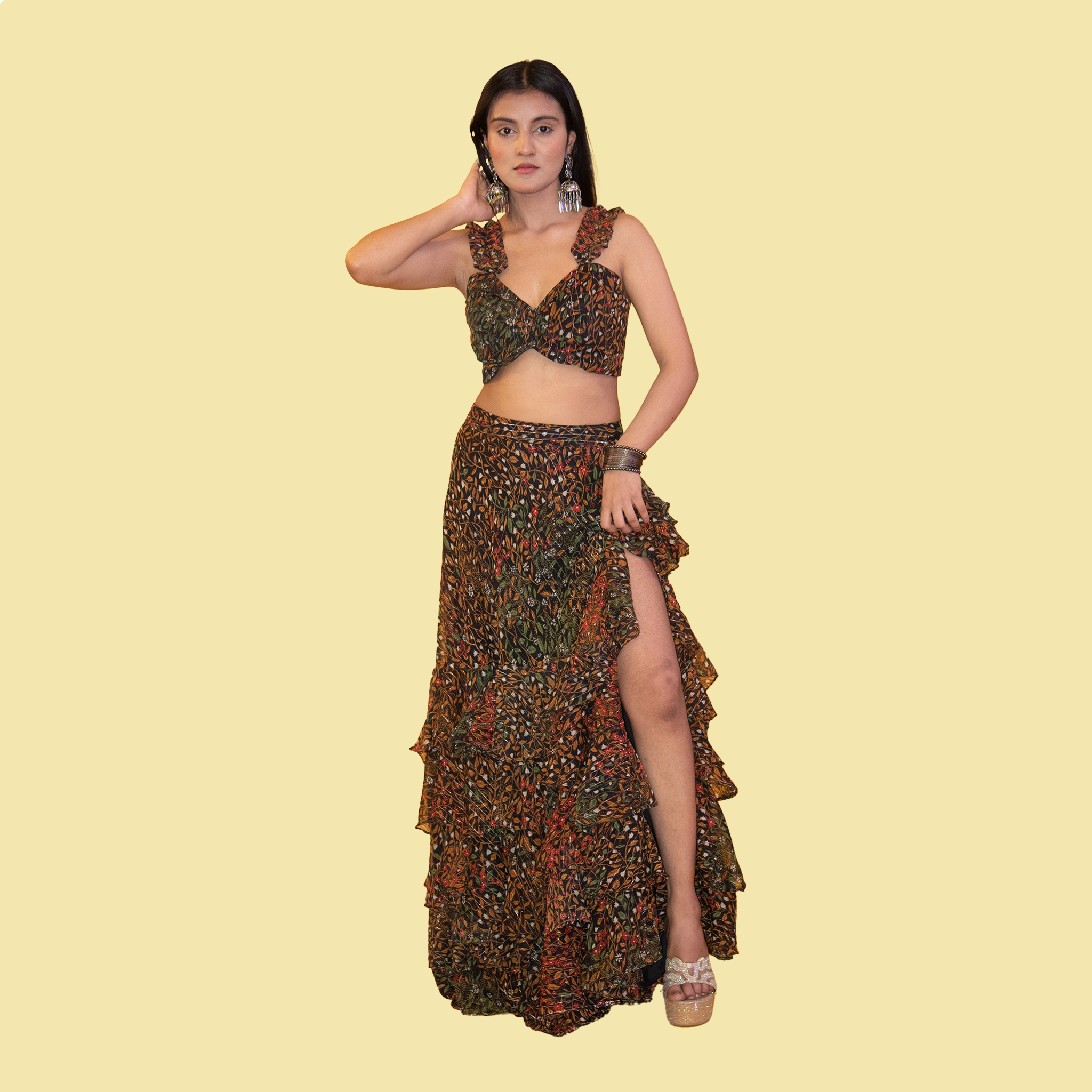 Sleeveless Crop Top and Floor Length Skirt Set - a captivating ensemble that effortlessly merges sophistication with modern allure. The Sleeveless Crop Top exudes contemporary charm with its sleek silhouette and chic design. Its sleeveless style ensures breathability and freedom of movement, while the cropped length adds a touch of playful elegance to your look. Complementing the top is the stunning Floor Length Skirt, which exudes timeless elegance and grace. Elevate your wardrobe with our Sleeveless Crop Top and Floor Length Skirt Set and step out in confidence and style.