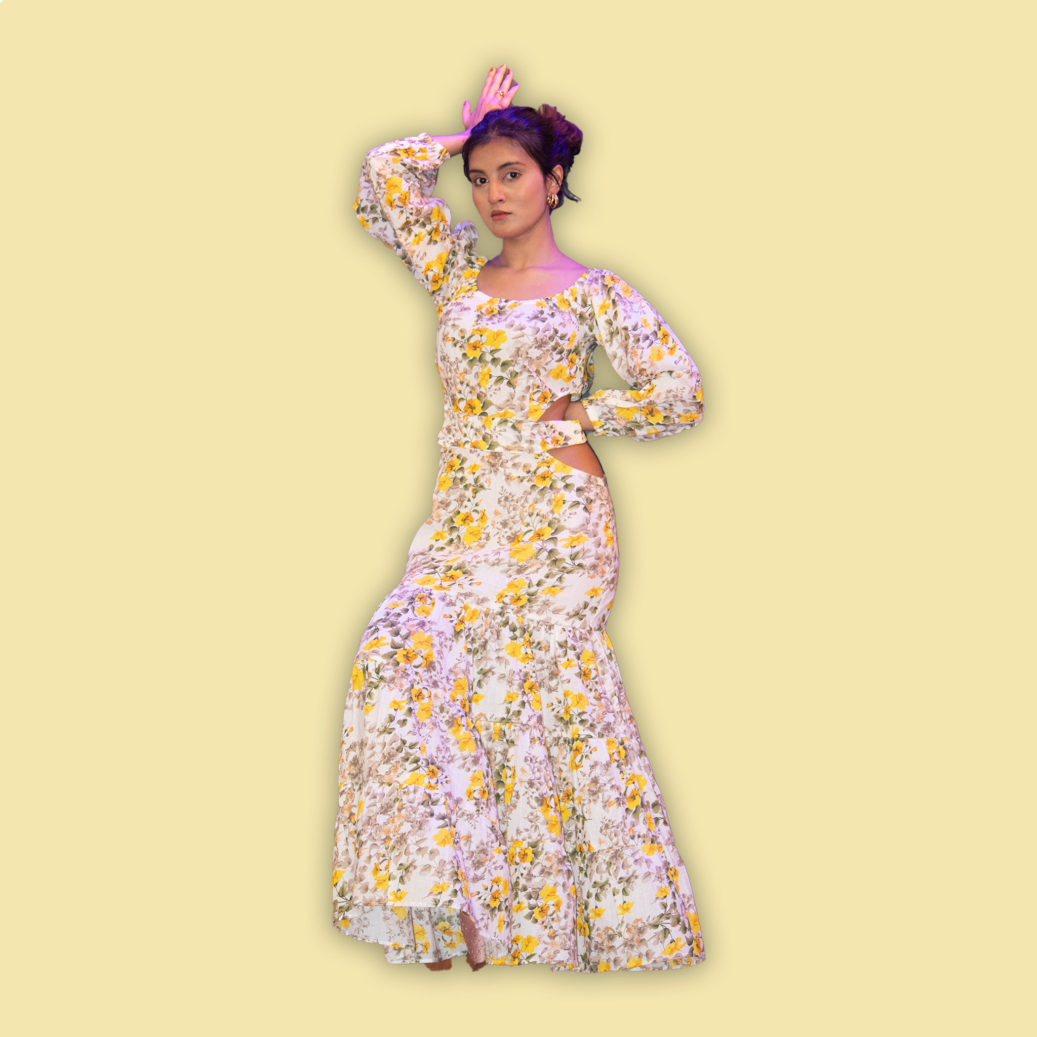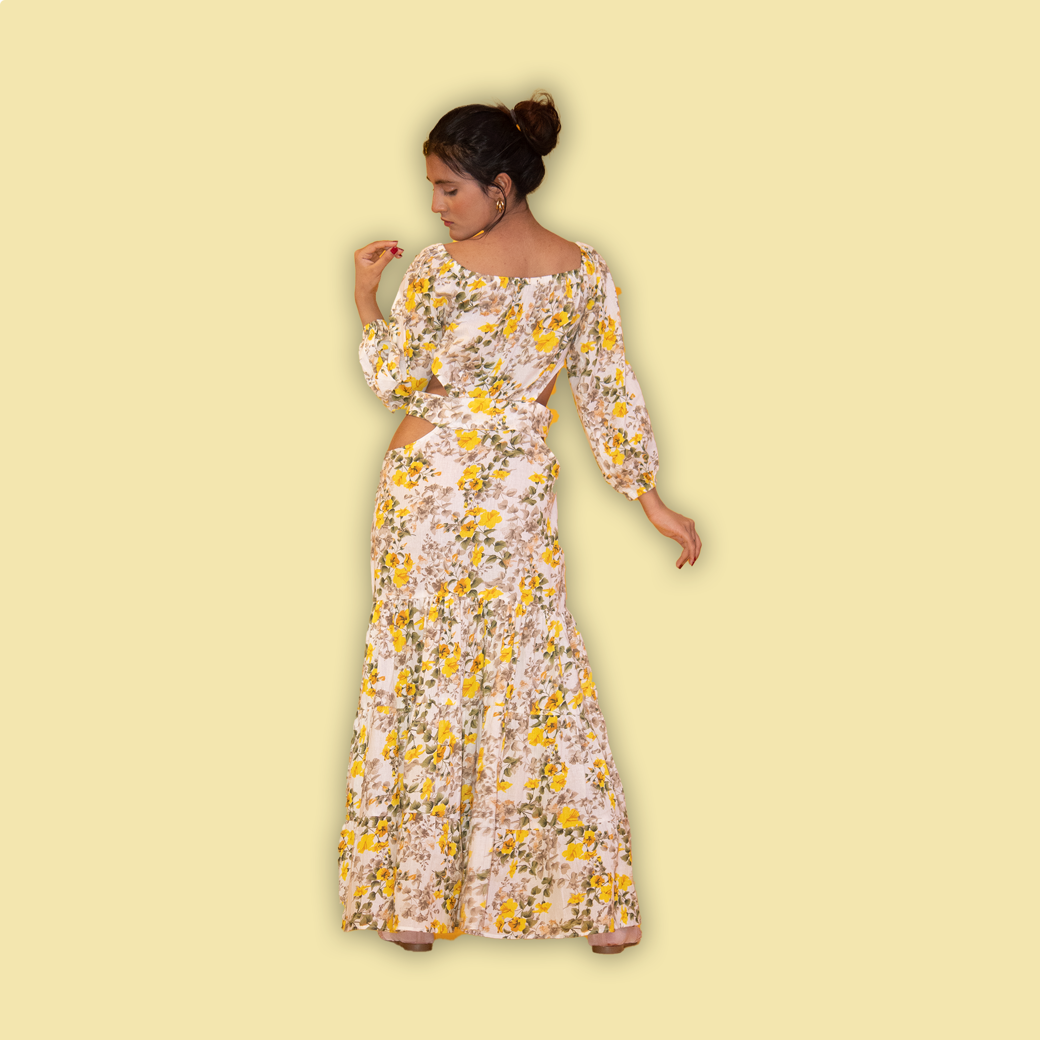Yellow Floral Print Cutout Maxi Dress - a vibrant statement piece that exudes summer charm and effortless elegance. Featuring a sunny yellow hue and a playful floral print, this maxi dress is perfect for embracing the warmth of the season in style. With its flattering cutout detailing and flowing silhouette, it offers a perfect balance of comfort and sophistication. Embrace the sunshine and add a touch of floral flair to your wardrobe with this must-have maxi dress.